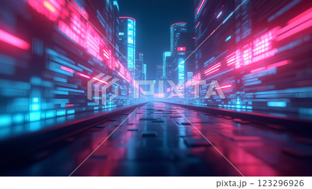 A digital stream of data with blue and pink light rays creates a futuristic and abstract background.