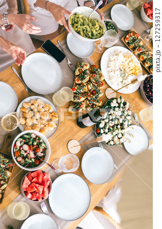 Top view of festive summer table with bruschetta, pasta, salad, cheese and watermelon, ready to eat