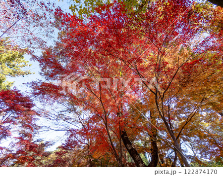 秋晴れに映える鮮やかに色づいた紅葉の散策路