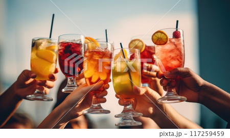 Friends hands clinking glasses with cocktails on bright background for joyful celebration. Summer vibe