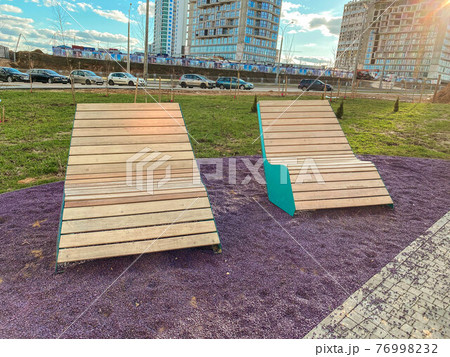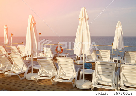 Sun white beds in the park. relax zone in the city. Improvement of public services, outdoor