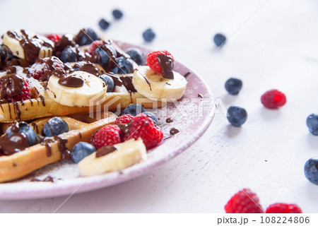 Tasty belgian waffles with blueberries, raspberries, bananas and sugar powder are filled with liquid chocolate.