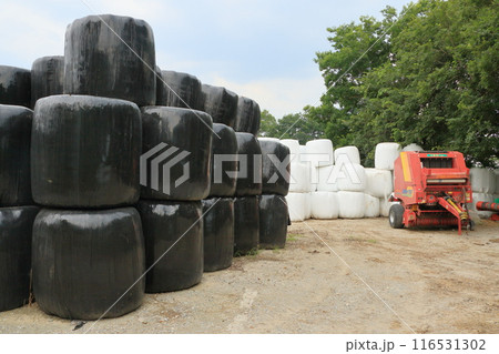積み上げられたラップサイレージ 貯蔵発酵される牧草