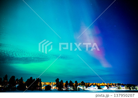 オーロラの夜空、オーロラが降り注ぐ夜の街