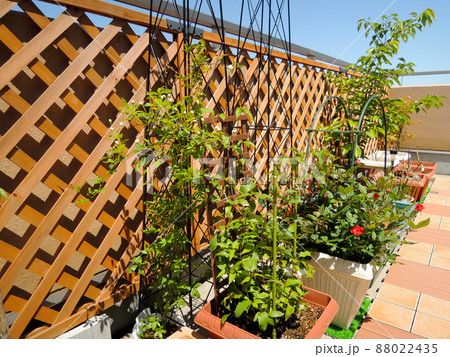 ルーフバルコニーにタイルとラティス ガーデニングでお花のある生活