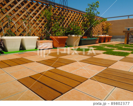 フラワーガーデン ルーフバルコニーに格子模様タイル敷き