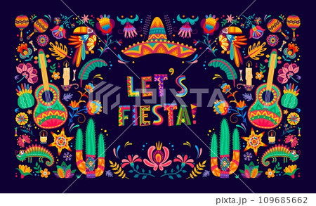 Let us fiesta mexican banner of Mexico holidays. Vector pattern of bright color flowers, sombrero, guitars and maracas, cactus, pinata, candles and toucan birds, tropical plant leaves and gecko lizard