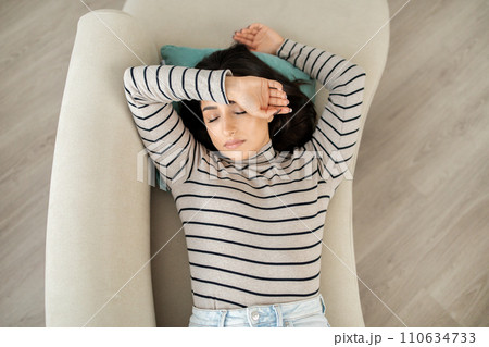 Serene young woman in a striped turtleneck lies on a couch with her eyes closed