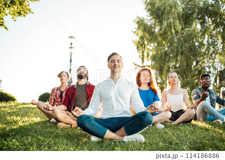 Group of adult mix-race friends meditating while practice yoga outside in park.