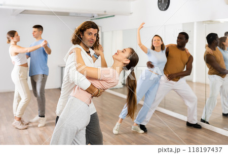 Cheerful diverse young adult people dancing together active expressive dances in pairs in modern class