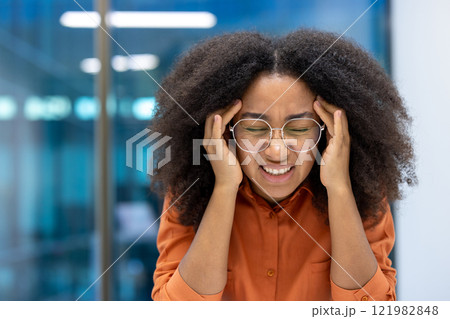 Headache, sick overworked and stressed woman at workplace close up. Businesswoman holding her head with hands while sitting at desk inside office.