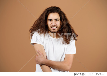 Unconfident hispanic young guy with long hair posing touching hand suffering from doubts and concerns, feeling unsure and uncomfortable standing over beige studio background