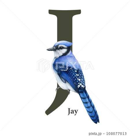 Capital letter J with jay bird decor. Watercolor illustration. Forest animal ABC alphabet font element. Wildlife animal alphabet letter J decorated blue jay bird. White background