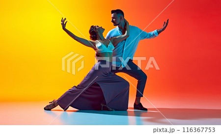 Elegance in motion. Stylish young couple, man and woman dancing bachata, performing against gradient yellow orange background in neon light