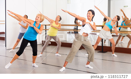 Dancing women stand in a ballet stance, where the choreographer helps to coordinate the movement