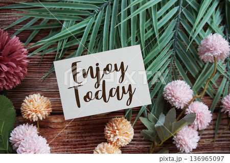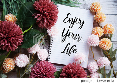 Enjoy Your Life Motivational and Inspirational quotes with flowers bouquet decoration on wooen background