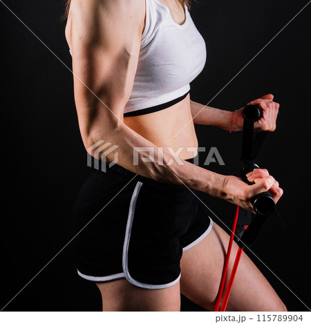 Athletic female performs exercises using a resistance band. Strength and motivation