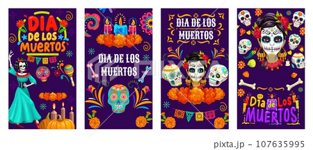 Mexican Day of the Dead Dia De Los Muertos holiday banners, Mexico Halloween calavera skulls vector characters. Cartoon sugar skulls, marigold flowers, altar candles and papel picado paper cut flags