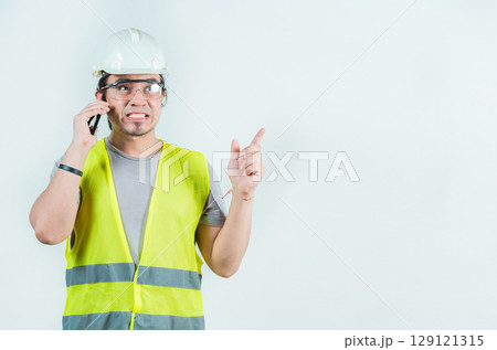 Handsome engineer calling on phone isolated. Constructor engineer talking phone isolated
