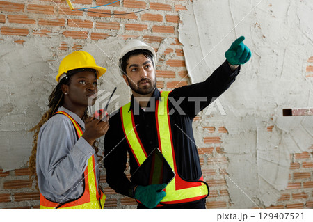Two construction workers discussing building plans on site. Wearing safety vests and helmets, they review documents and data on digital tablet.