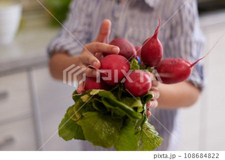 Closeup woman hands holding out at camera a bunch of fresh ripe organic radish. Healthy eating, vegetarianism, dieting
