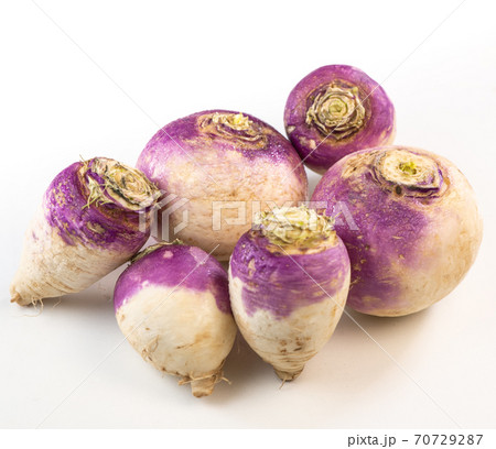 Freshly harvested spring turnips, Brassica rapa, on white background