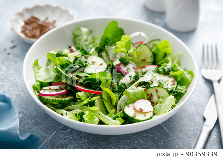 Salad with fresh green lettuce, radish and cucumber