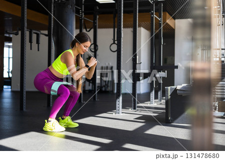 Fitness woman making squat with rubber band training butts at sportive gym