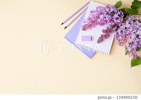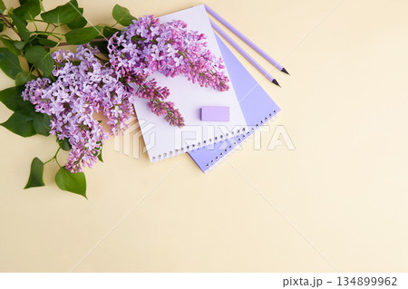 A notebook, pencils, and lilac branches on a yellow background.