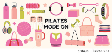 Set of accessories for pilates and home workout. Fitness, stretching and healthy lifestyle concept. Trendy modern vector illustration isolated on background, hand drawn, flat design