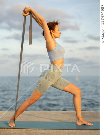 Atletic woman doing yoga with stretch band on seashore