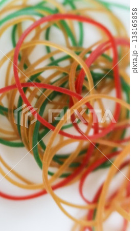 vertical photo of close up of a tangled pile of red, green, yellow and tan rubber bands on a clean white table surface with copy space