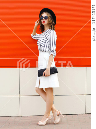 full-length beautiful young woman model in white striped shirt, black handbag clutch, hat, skirt