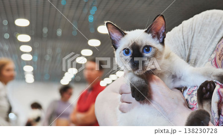 Breeder holding adorable thai kitten with blue eyes at cat show