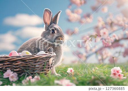 Easter bunny rabbit and Easter eggs in the basket on green grass field in spring. generative ai