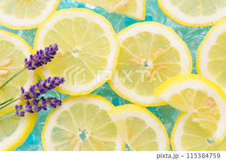 アクリルアイスと炭酸水のブルーとレモンとラベンダーの背景
