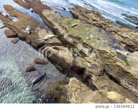 Sea lions and seals napping on a cove under the sun at La Jolla, San Diego, California.