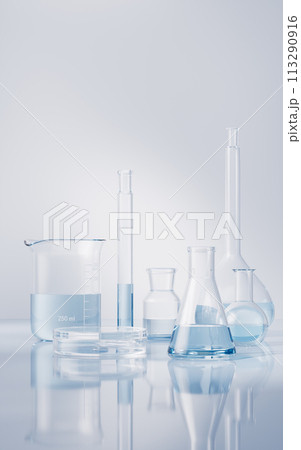 Modern medical research laboratory glassware with biochemicals on the table. Some scientists are working or researching on these chemicals. Concept of chemical, scientific experiment