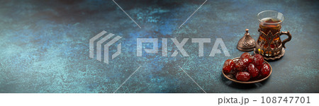 Breaking fasting with dried dates during Ramadan Kareem, Iftar meal with dates and Arab tea in traditional glass, angle view on rustic blue background. Muslim feast