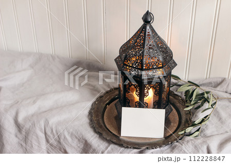 Ramadan Kareem holiday still life. Dark Moroccan lantern with olive tree branches on silver tray. Linen table cloth. Blank greeting card, invitation mockup on wooden table. Festive photo. Top view