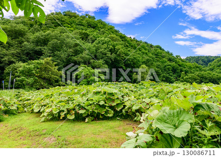 北海道足寄町「ラワンブキ鑑賞圃場」自生する巨大フキと夏の青空
