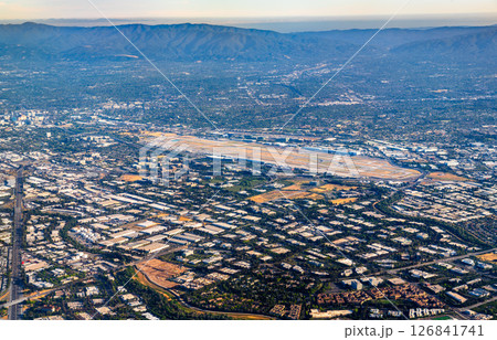 Aerial panorama of San Jose Mineta International Airport in California, showing its runways surrounded by a grid of industrial buildings, residential areas, and the Santa Clara Valley foothills in the