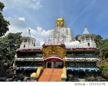 ゴールデンテンプルと修復中の黄金の仏像、ダンブッラ石窟寺院のふもと