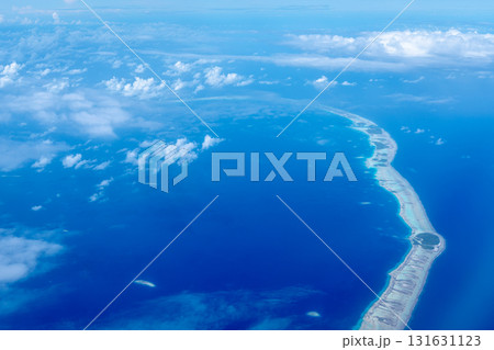 Aerial view of the Tuamotus atoll in French Polynesia with clouds