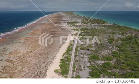 Aerial flight over Rangiroa atoll in French Polynesia, dividing the turquoise lagoon and the deep blue Pacific Ocean, showing the reef, the vegetation and a pink sand road. Travel background