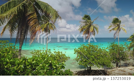 French Polynesia, Rangiroa island: aerial perspective of tropical paradise, swaying palm trees and vibrant turquoise ocean waters. The serene coastline lush green vegetation. Drone flight