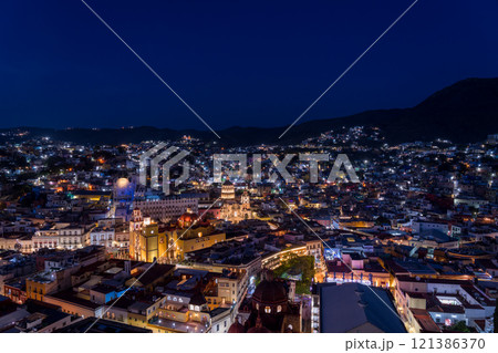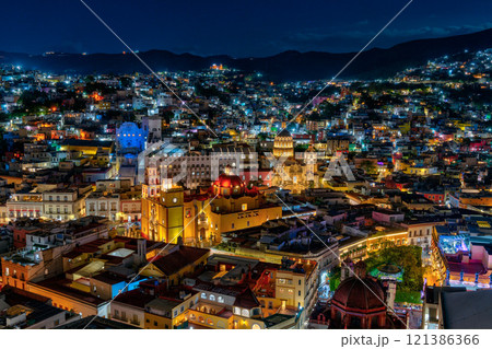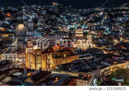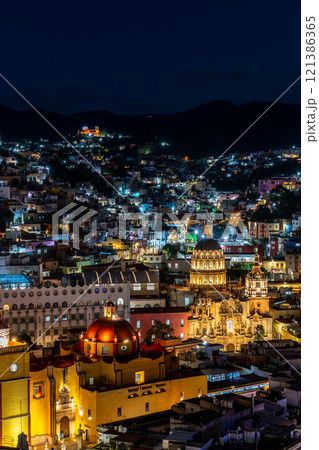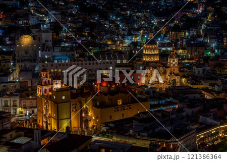 グアナファトの都市風景とバシリカ教会(グアナフアト大聖堂)とラ・コンパニーア聖堂の夜景