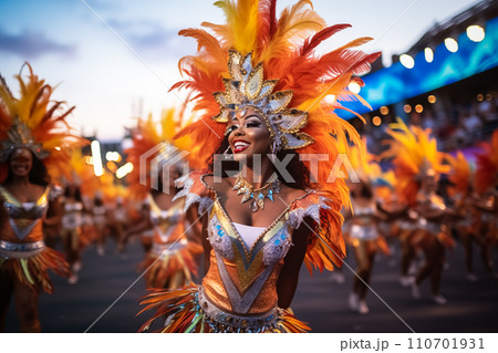 街中の通りでサンバを踊るブラジルの人たちの衣装