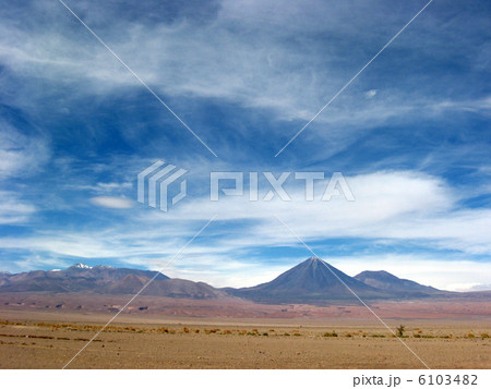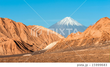晴れわたる南米チリ北部のアタカマ砂漠から望むリカンカブール火山とアンデスの山並み