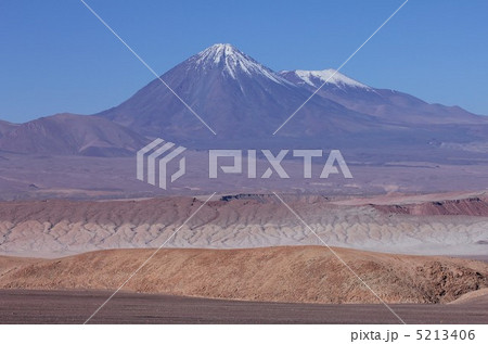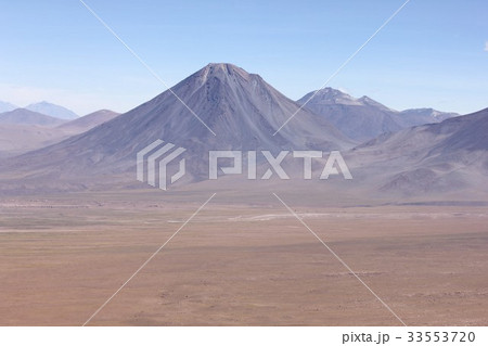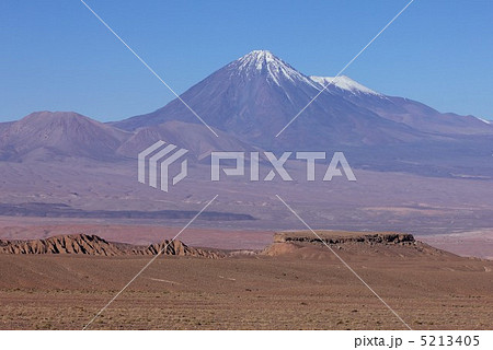 晴れわたる南米チリ北部のアタカマ砂漠から望むリカンカブール火山とアンデスの山並み